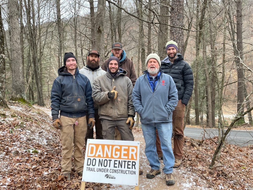 Last week, the International Mountain Bicycling Association (IMBA) Trail Solutions team finished their three month long project to build the first three miles of beginner and intermediate adaptive mountain bike trail in Lost River State Park. This is the first phase of a multi-year project which may ultimately result in 30-40 miles of mountain bike trail. The first phase began in the recently-acquired acreage in the northwest corner of state park property, along Dove Hollow Road, less than a half a mile south of the northern intersection of Whetzel Hollow Road. Click here for the position. The new trails are ready for riding–in fact, the Hardy County Cryptids NICA team rode the trails two weeks ago for the first time. Although the trails have been constructed, work still remains to build the signage and trailhead map. The trails have not yet been named, mapped for GPS, and uploaded into the official WV State Parks maps or Trailforks.com, but check back on this progress later in the spring.